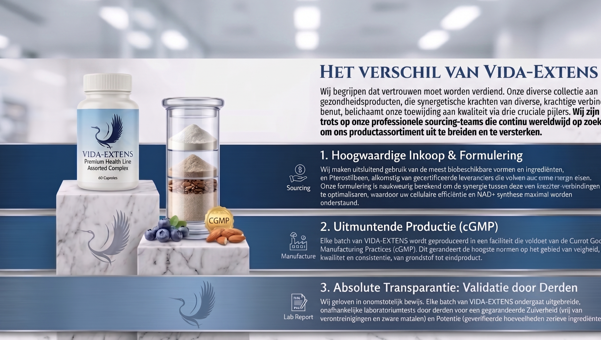 Een langer leven is niet genoeg; we willen een vitaler leven. VIDA-EXTENS is opgericht op basis van een eenvoudig principe: de meest krachtige ingrediënten uit de natuur benutten en deze valideren met de wetenschap. Het resultaat is een nieuwe standaard in supplementen voor iedereen die serieus werk maakt van hun gezondheid op de lange termijn.